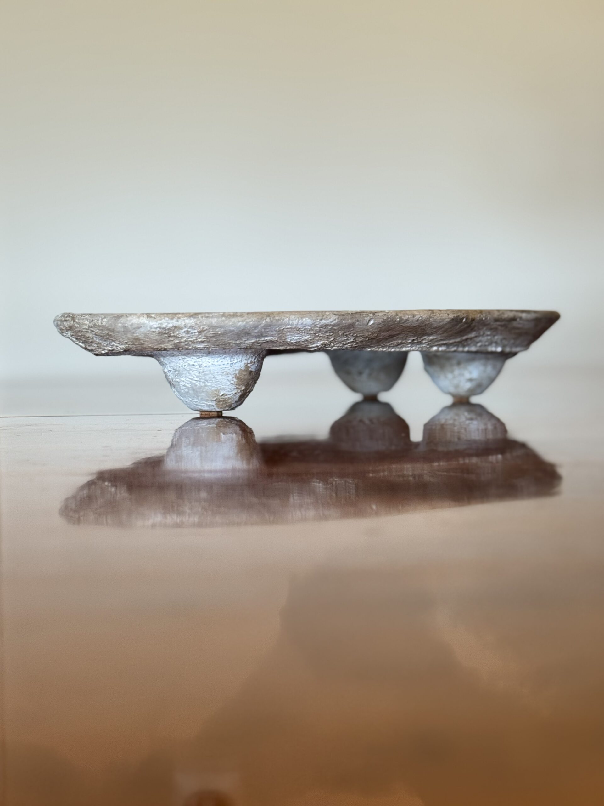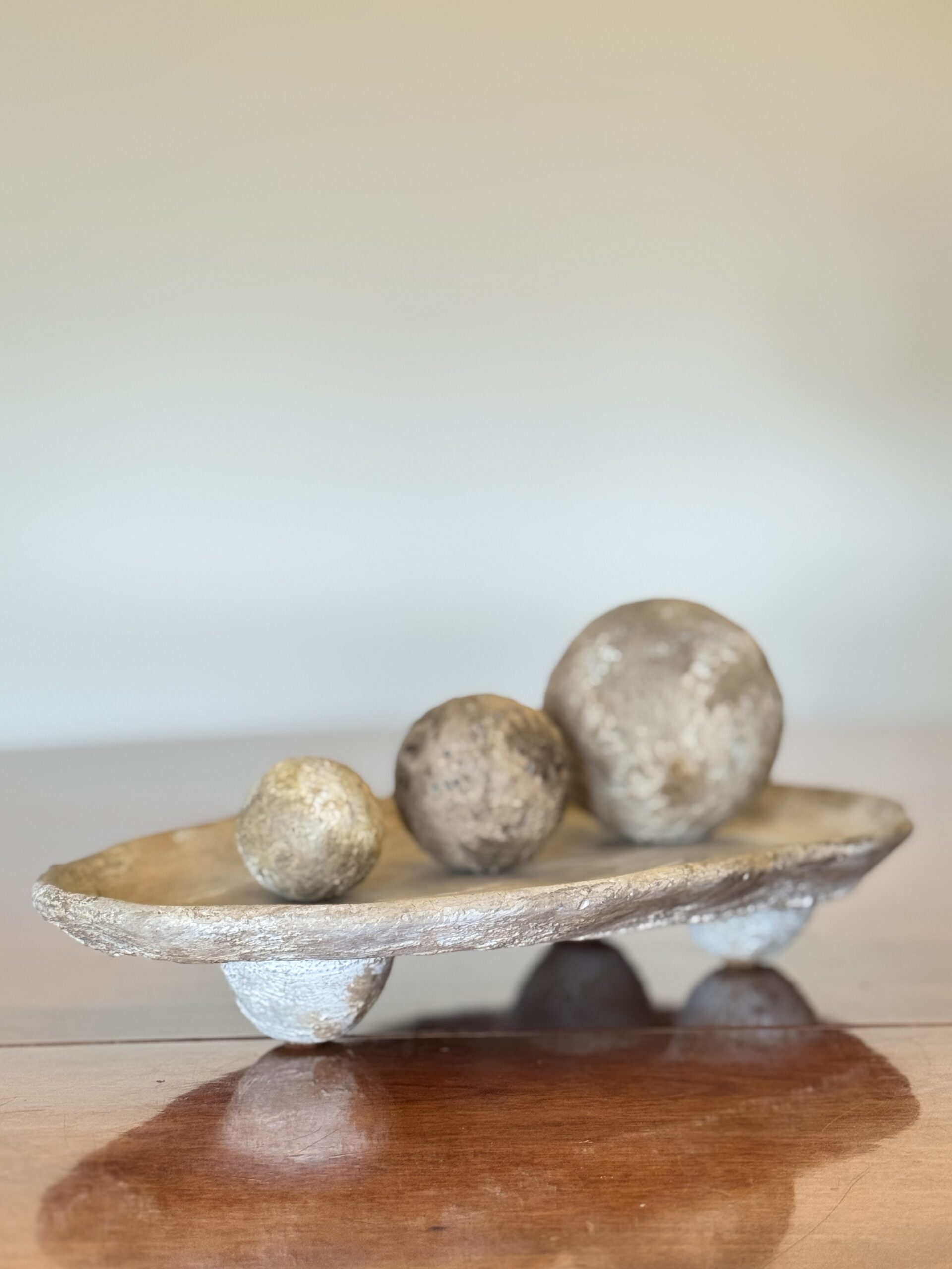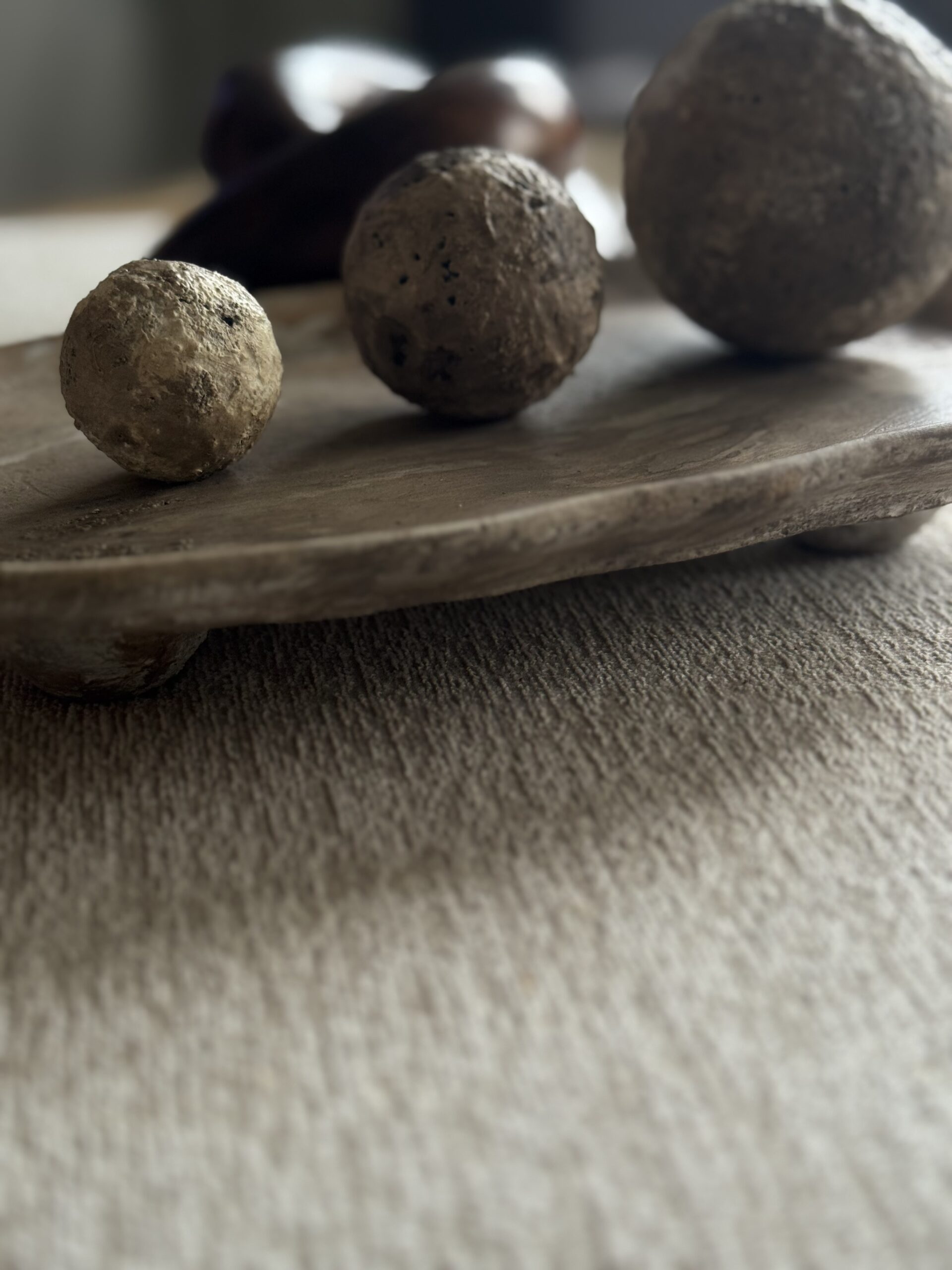 The Zala Tray is a handcrafted pedestal tray made from cement, designed to elevate your styling moments. Its low profile and three rounded feet create a sturdy base, while its raw edges and layered tones give it an aged, grounded feel.