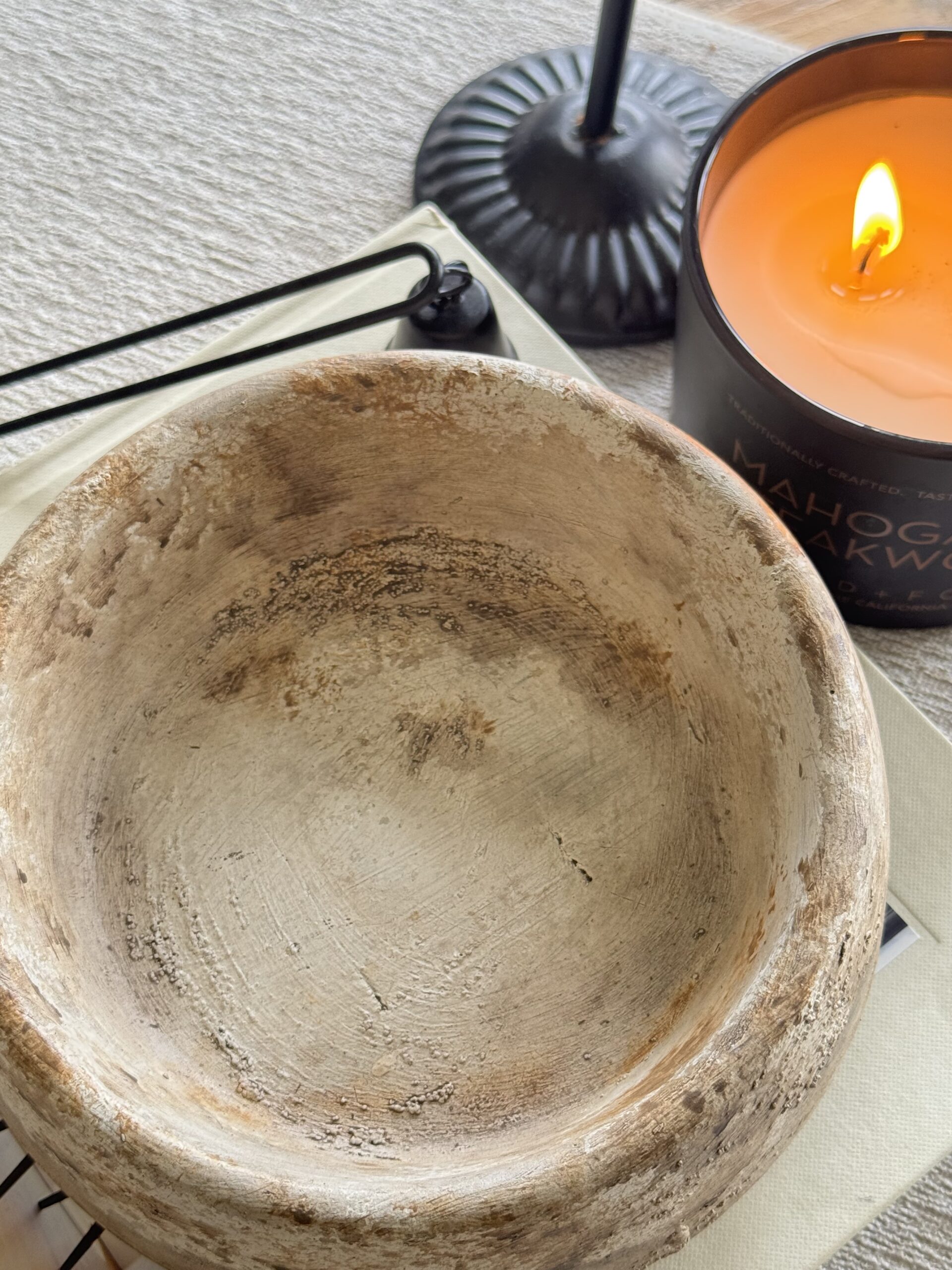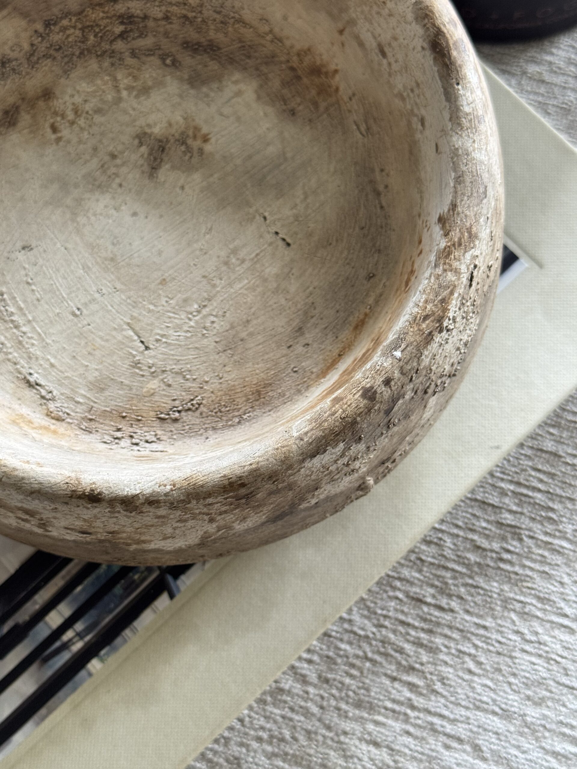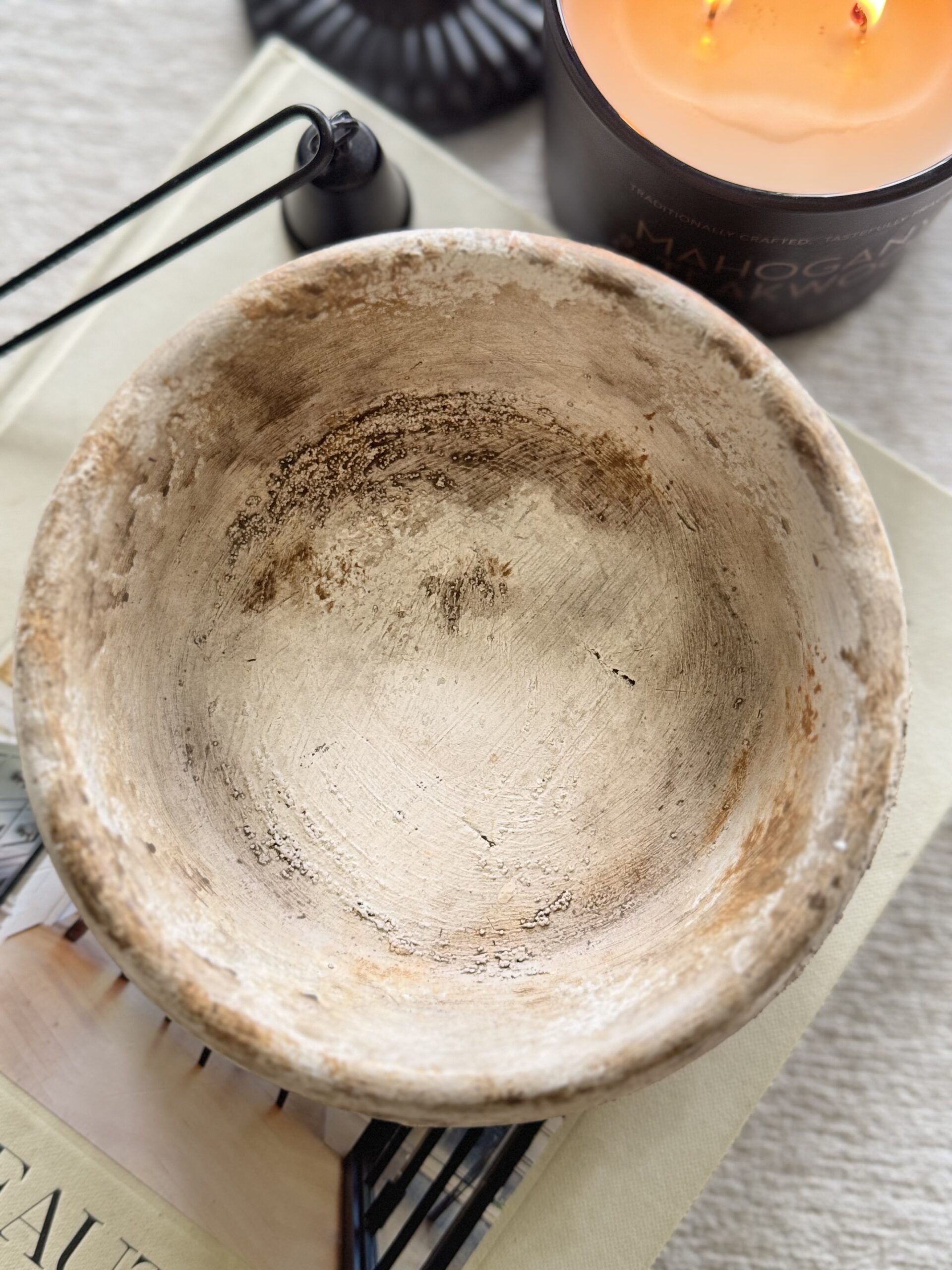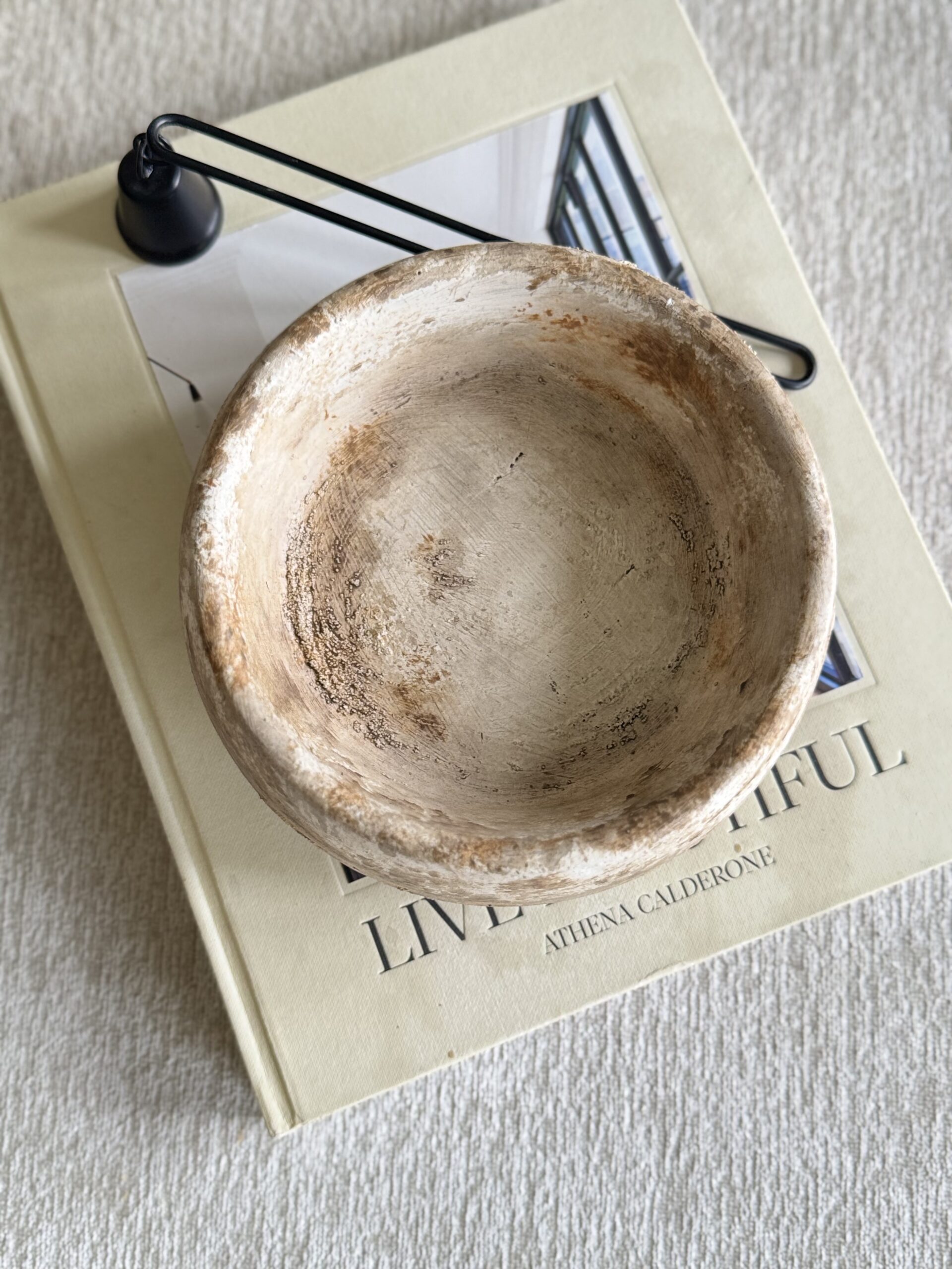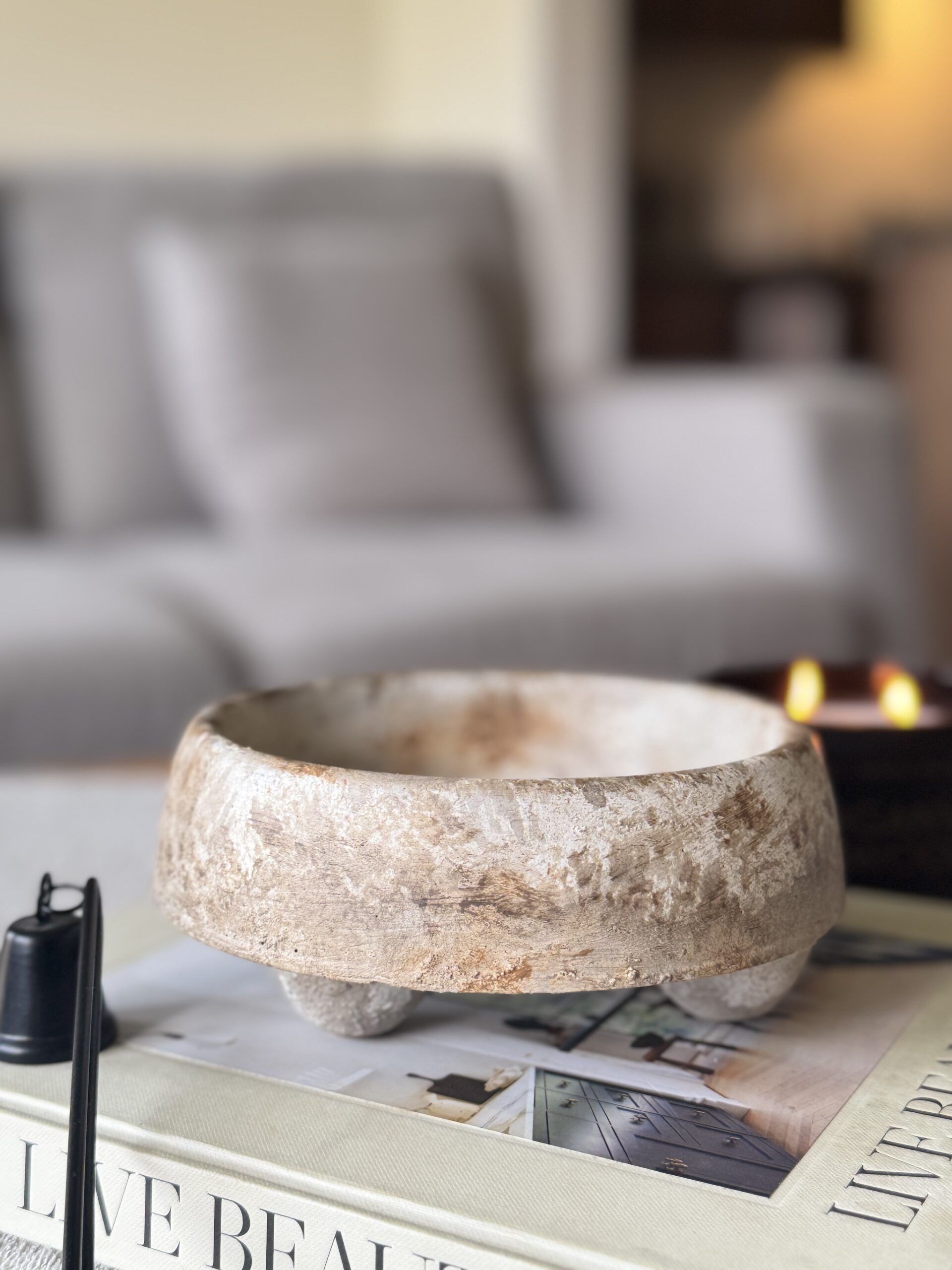 The Maji Bowl brings rustic charm and quiet elegance to your space. Handcrafted from cement, this piece is finished with layered earthy tones white distresses, with soft touches of coffee latte, brown, and caramel, spray sealed. Each leg is accented in white paint for contrast, and cork dots beneath protect your surfaces.